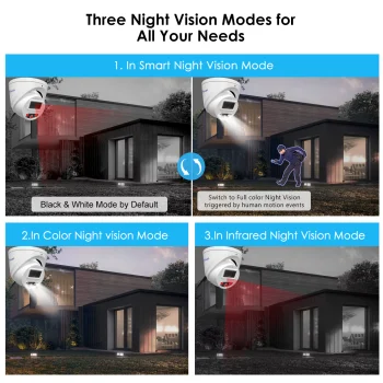 - Default Smart light mode:IR works normally at night, the white light on and turns the vision into color when human&vehicle are detected.